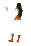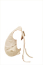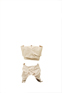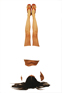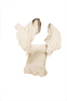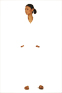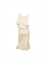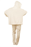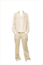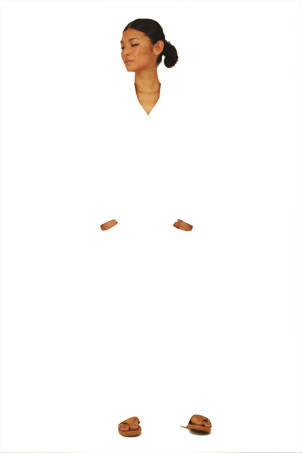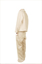 人はいつ描くということをやめることができるのか。アジアの絵画の 伝統の中には代々伝えられてきた形を完璧にまた極度の集中力をもっ て再現できる画家が名人である(または名人として描くことを止める ことができる)と見なされるものがある。彼等はこのように余分なも のを捨てて、また伝統と格闘することによって新しい形式を創造する 力を獲得する。 人はいつ服を創作することを止めることができるのか。この問いには こんな風に答えることができよう:余分なものを削ぎ取ることで、集 中することで、伝統との格闘によって「完成された」服を作った時に、 と。エドウィナ ホールの「裸の王様」コレクションの作品では形も 色も後退して服を着ている人はまるで裸でいるように見える。白、薄 いグレー、肌色の布が単純なカットで、まるで「見えない」糸で縫っ たようにして体にまとわりつく。長く引き延ばしたシャツ、腰の回り や背中にずり落ちてくるシャツが服である。頭や身体を大きなテント にように包み込む白いジャケット、身体のまん中にたっぷり余裕をの こしたオーバーオール。首に巻かれた肌色の縄と生きるのに必要なも のだけを詰め込んだ、また放浪の旅のための大きな大きな袋。人がい つも着ている服なのにこんな風には着たことがない。童話の「王様の あたらしい服」の王のようにその服を着る人は楽に動いているのに、 見る者たちは自信がない:この人は服を着ているのだろうか?私が見 ているのは服?それとも服を見たことがあるからそうだと思っている 物だろうか?見方の問題?触ってみれば服なのか?これは一体なんだ ろう。服それとも裸?服ならどんな服なのだろう?