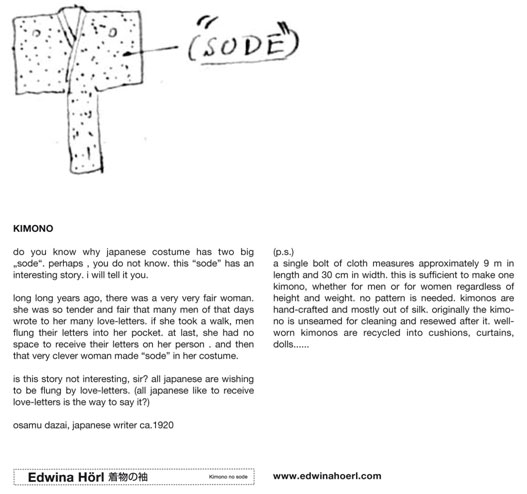 KIMONO NO SODE <the kimono’s sleeve> presents a remake collection, in the mode of cultural transfer. A reflection on a Japanese sartorial tradition from a European perspective. The title of the collection comes from an essay by the Japanese writer Osamu Dazai, in which the shape of the kimono’s sleeve is explained.